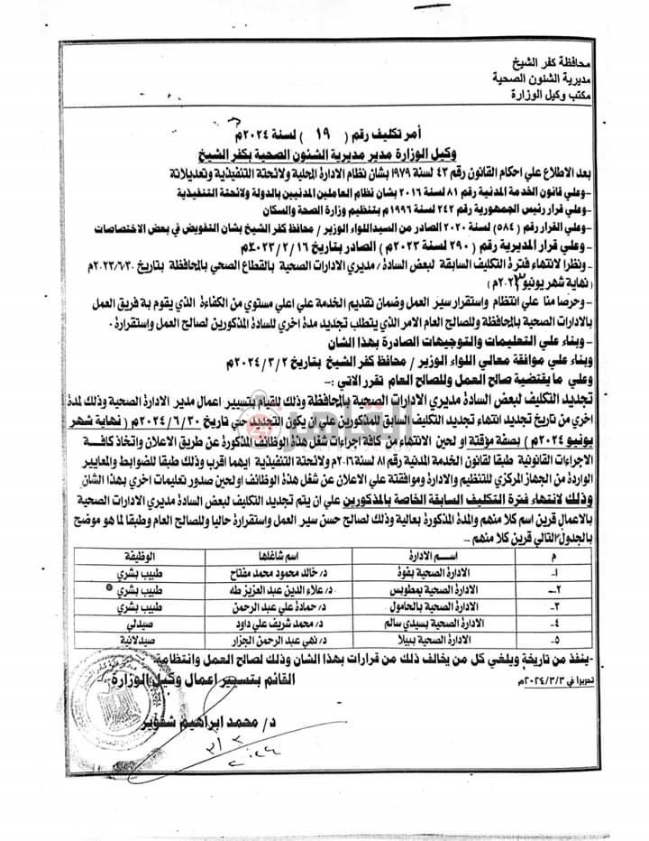 كما شمل القرار تجديد التكليف لـ 5 مدراء إدارات صحية، وتجديد التكليف لـ 6 مدراء مستشفيات، حيث تهدف هذه الحركة إلى تحسين سير العمل وضمان تقديم الخدمة على أعلى مستوى من الكفاءة.