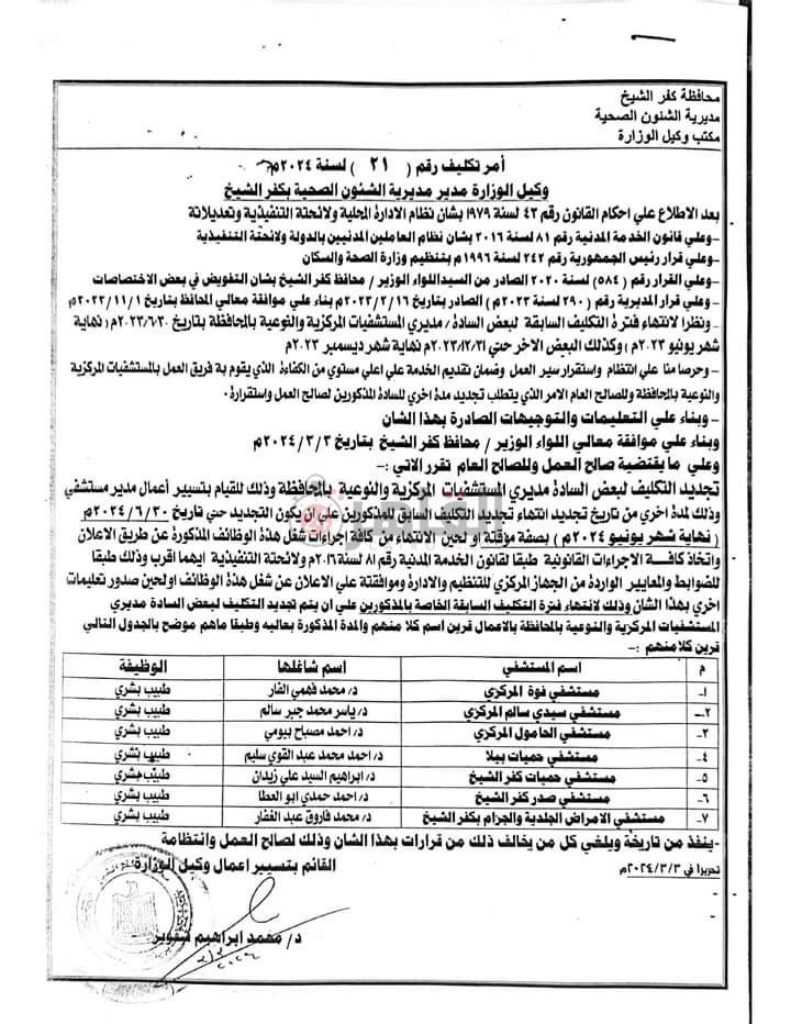 وتضمن القرار الذي حصل القاهرة 24 على صورة ضوئية منه، تجديد التكليف لبعض مديري الإدارات الصحية والمستشفيات، وذلك لمدة 3 أشهر من تاريخ تجديد انتهاء التكليف السابق للمذكورين، على أن يكون التجديد حتى تاريخ 2024/6/20م (نهاية شهر يونيو 2024م) بصفة مؤقتة أو لحين الانتهاء من جميع إجراءات شغل هذه الوظائف المذكورة عن طريق الإعلان واتخاذ جميع الإجراءات القانونية طبقا لقانون الخدمة المدنية ولائحته التنفيذية أيهما أقرب وذلك طبقا للضوابط والمعايير أو لحين صدور تعليمات أخرى بهذا الشأن.