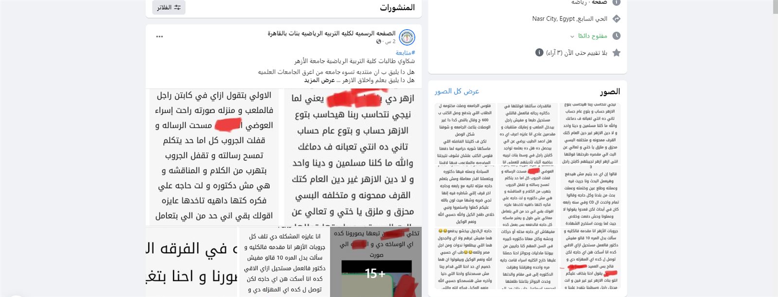 وأنشأت الطالبات صفحة عبر موقع التواصل الاجتماعي فيس بوك، تحت اسم: الصفحة الرسمية لكلية التربية الرياضية بنات بالقاهرة، دون الكشف عن هويتهن خوفا من العميد حسب قولهن عبر الصفحة.