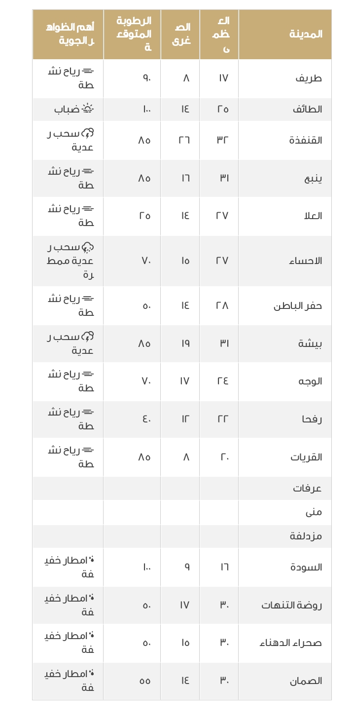 وفيما يلي بيان بـ درجات الحرارة العظمى والصغرى بالدرجة المئوية والظواهر الجوية: