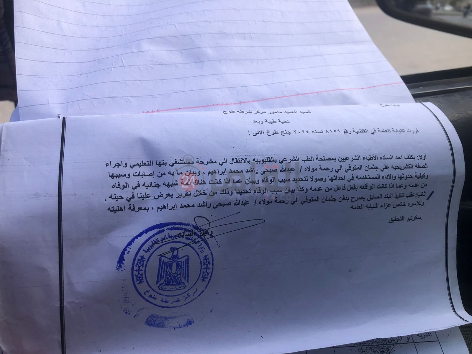 حيث جاء في القرار انتداب أحد أطباء الشرعيين بمصلحة الطب الشرعي بالقليوبية بالانتقال لمشرحة مستشفى بنها التعليمي، واجراء الصفة التشريحية، وبيان ما بها من إصابات وسبب وكيفية حدوثها والإدارة المستخدمة وصولا لتحديد سبب الوفاة، وبيان عما كانت هناك شبهة جنائية بالواقعة من عدمه وبيان عما كانت بفعل فاعل من عدمه وتحديد سبب الوفاة تحديدا وذلك من خلال تقرير يعرض علينا.