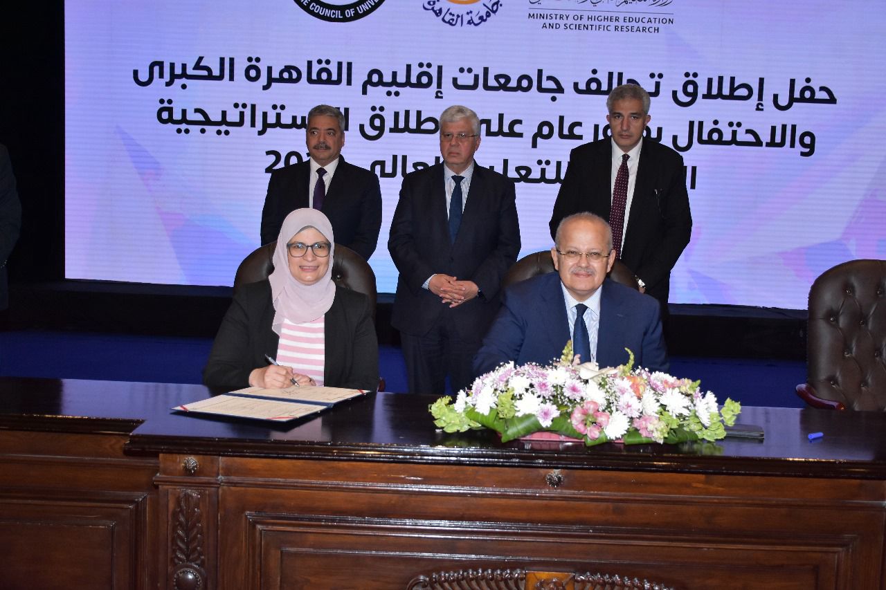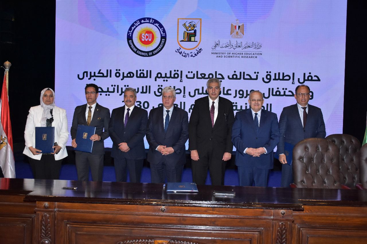 شهدت قاعة الاحتفالات الكبرى بجامعة القاهرة، توقيع عدة بروتوكولات تعاون بين جامعات القاهرة، وعين شمس، وحلوان، وبنها، والأزهر، وبعض الجامعات الخاصة وهيئة تنمية الصناعات، لإطلاق تحالف جامعات إقليم القاهرة الكبرى برئاسة الدكتور محمد الخشت، بحضور الدكتور أيمن عاشور وزير التعليم العالي والبحث العلمي، والدكتور مصطفى رفعت أمين عام المجلس الأعلى للجامعات، وعدد من رؤساء الجامعات الحكومية والأهلية والخاصة والتكنولوجية، وشركاء الصناعة بإقليم القاهرة الكبرى، ونواب رئيس الجامعة وعمداء الكليات، ولفيف من أعضاء هيئة التدريس.