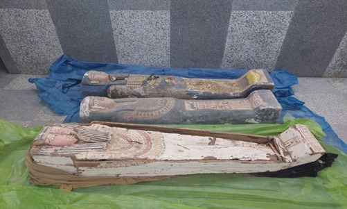 عقب تقنين الإجراءات تم استهدافهم وأمكن ضبطهم، وبحوزتهم 437 قطعة أثرية عبارة عن 3 توابيت خشبية بداخل إحداها مومياء، 400 تمثال حجري و29 تميمة و2 قناع خشبي خاص بالتوابيت المضبوطة وتمثال خشبي و2 قنينة من الفخار.