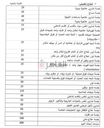 وتراوحت أسعار جلسات العلاج الطبيعي، وفقا للائحة الاسترشادية الجديدة ما بين 20 جنيه لجلسة تمارين علاجية يدوية إلى 400 جنيه لدراسة أبحاث النوم، بعدما كانت تبدأ من 5 جنيات لتشهد ارتفاع كبيرًا في الأسعار.