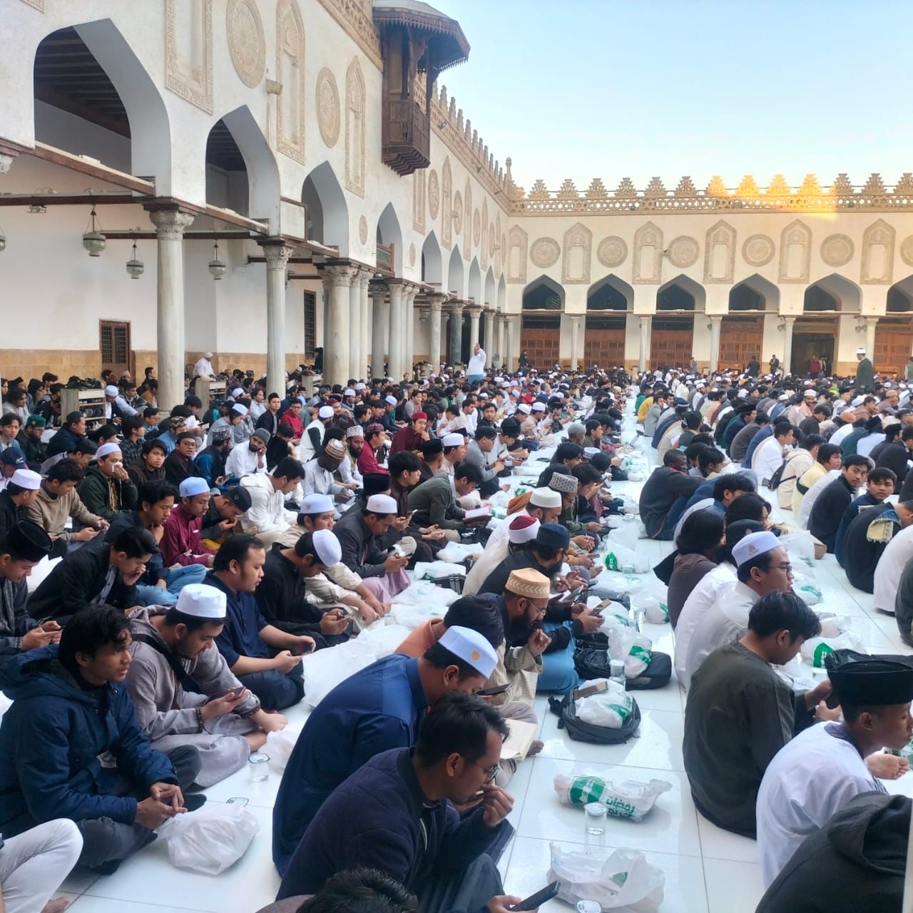 شارك الدكتور محمد الضويني، وكيل الأزهر الشريف، مع الطلاب الوافدين بالأزهر، في الإفطار الجماعي بصحن الجامع الأزهر، حيث ينظم الجامع إفطارًا جماعيًّا للعام الثالث للطلاب الوافدين بواقع 5000 آلاف وجبة يوميًّا، وبإجمالي 150 ألف وجبة للشهر، وذلك في إطار الدور الإنساني والديني الذي يقوم به الأزهر في خدمة ورعاية أبنائه الوافدين ضيوف مصر.