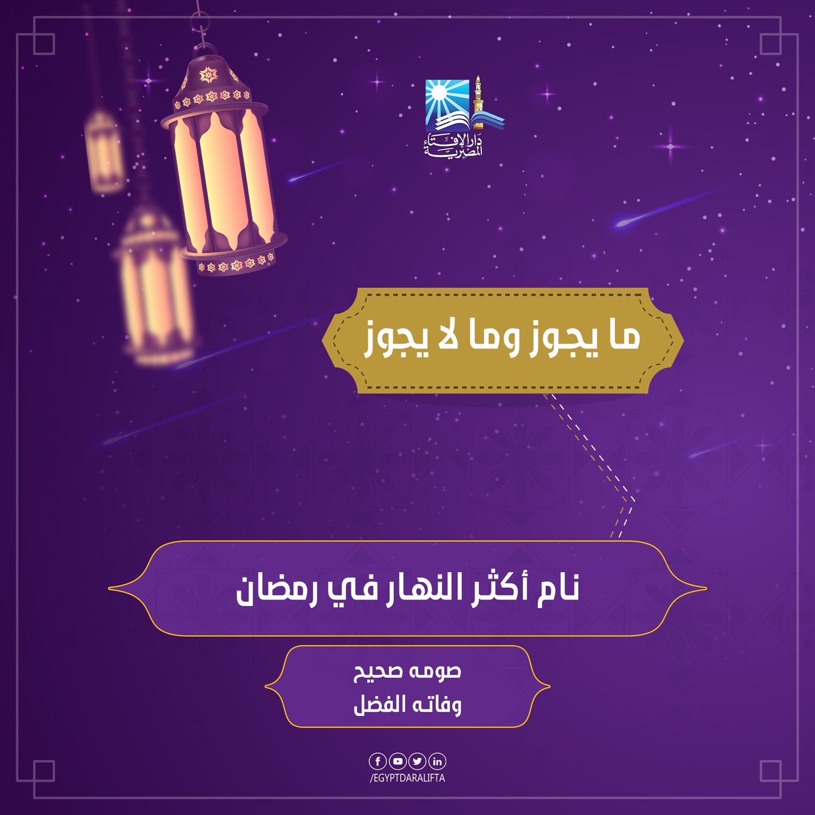 يخشى العديد من المسلمين أن يكون النوم من مبطلات الصيام، لكن الصفحة الرسمية لدار الإفتاء المصرية أوضحت في منشور سابق لها على موقع التواصل الاجتماعي فيس بوك، مبطلات الصيام والتي تنحصر في: