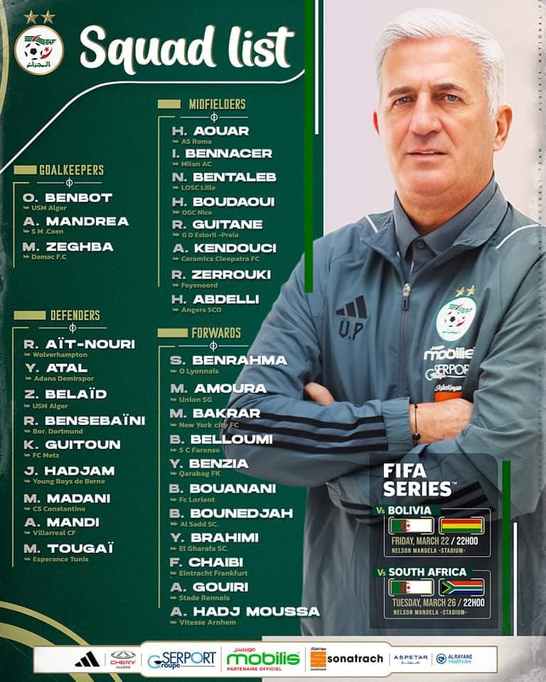والجدير بالذكر أن منتخب الجزائر سيخوض في التوقف الدولي القادم مواجهات ودية أمام بوليفيا في 22 مارس الجاري، كما سيخوض مواجهة أخرى أمام نظيره جنوب إفريقيا في 26 من الشهر ذاته.