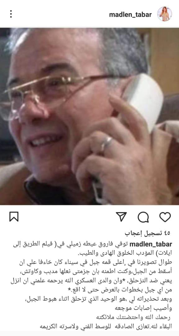 شاركت مادلين مطر متابعيه صورة للفنان فاروق عيطة، عبر حسابها الشخصي بموقع انستجرام، وعلقت عليها قائلة: توفى فاروق عيطة زميلي في فيلم الطريق إلى إيلات، المؤدب الخلوق الهادي والطيب.