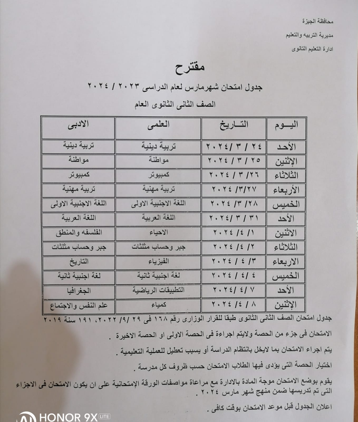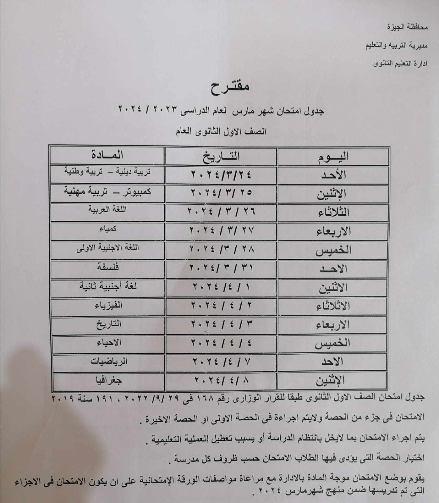 جدول امتحانات شهر مارس لطلاب الأول والثاني الثانوي 2024 بالجيزة