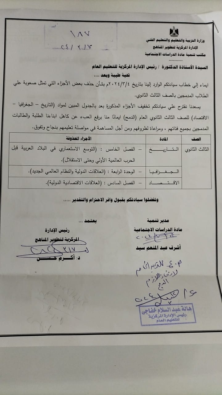 محذوفات مواد التاريخ والجغرافيا والاقتصاد لطلاب الثانوية العامة الدمج