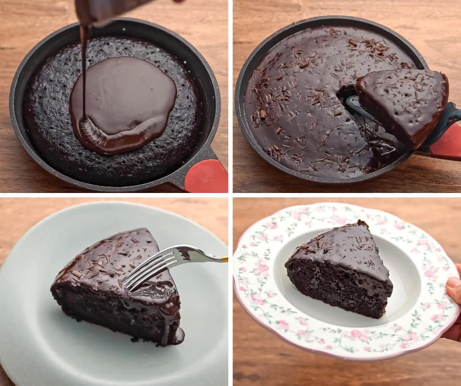- نخرج القالب من الفرن ونتركه يبرد تمامًا، ونقلب الكيكة ونصب عليها صوص الشوكولاتة.
