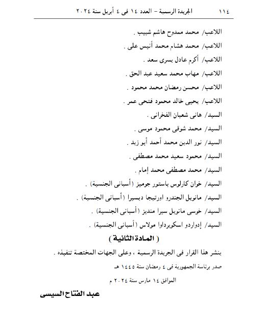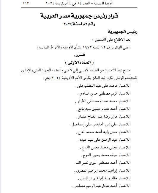 ونشرت الجريدة الرسمية قرار منح لاعبي منتخب مصر لكرة اليد وأعضاء الجهاز الفني للمنتخب، وكذلك أعضاء الجهازين الطبي والإداري نوط الامتياز من الدرجة الأولى.