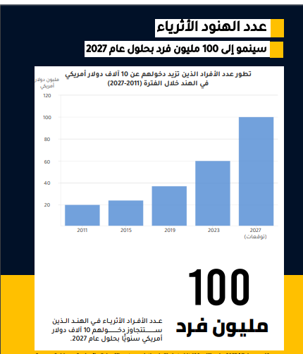 استعرض مركز المعلومات ودعم اتخاذ القرار بـ مجلس الوزراء، تطور عدد الأفراد الذين تزيد دخولهم عن 10 آلاف دولار أمريكي، في الهند خلال الفترة 2011-2022، لافتا أن عدد الهنود الأثرياء سينمو إلى 100 مليون فرد بحلول عام 2027.