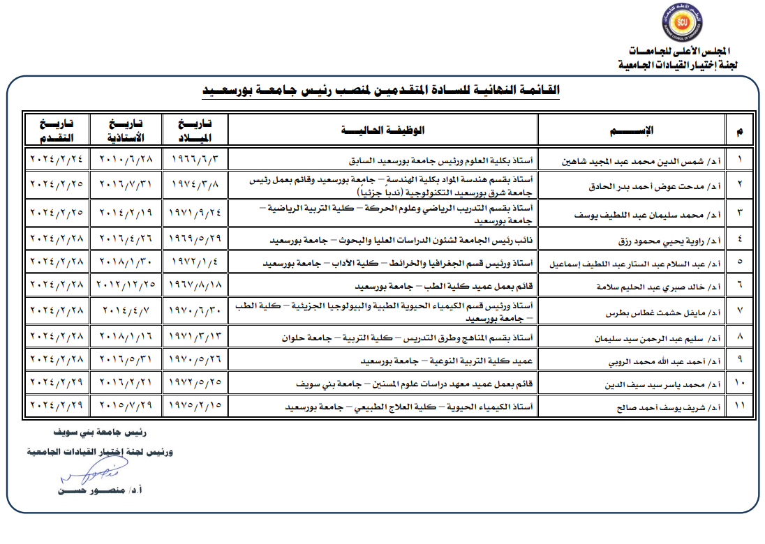 القائمة النهائية للمتقدمين لمنصب رئيس جامعة بورسعيد
