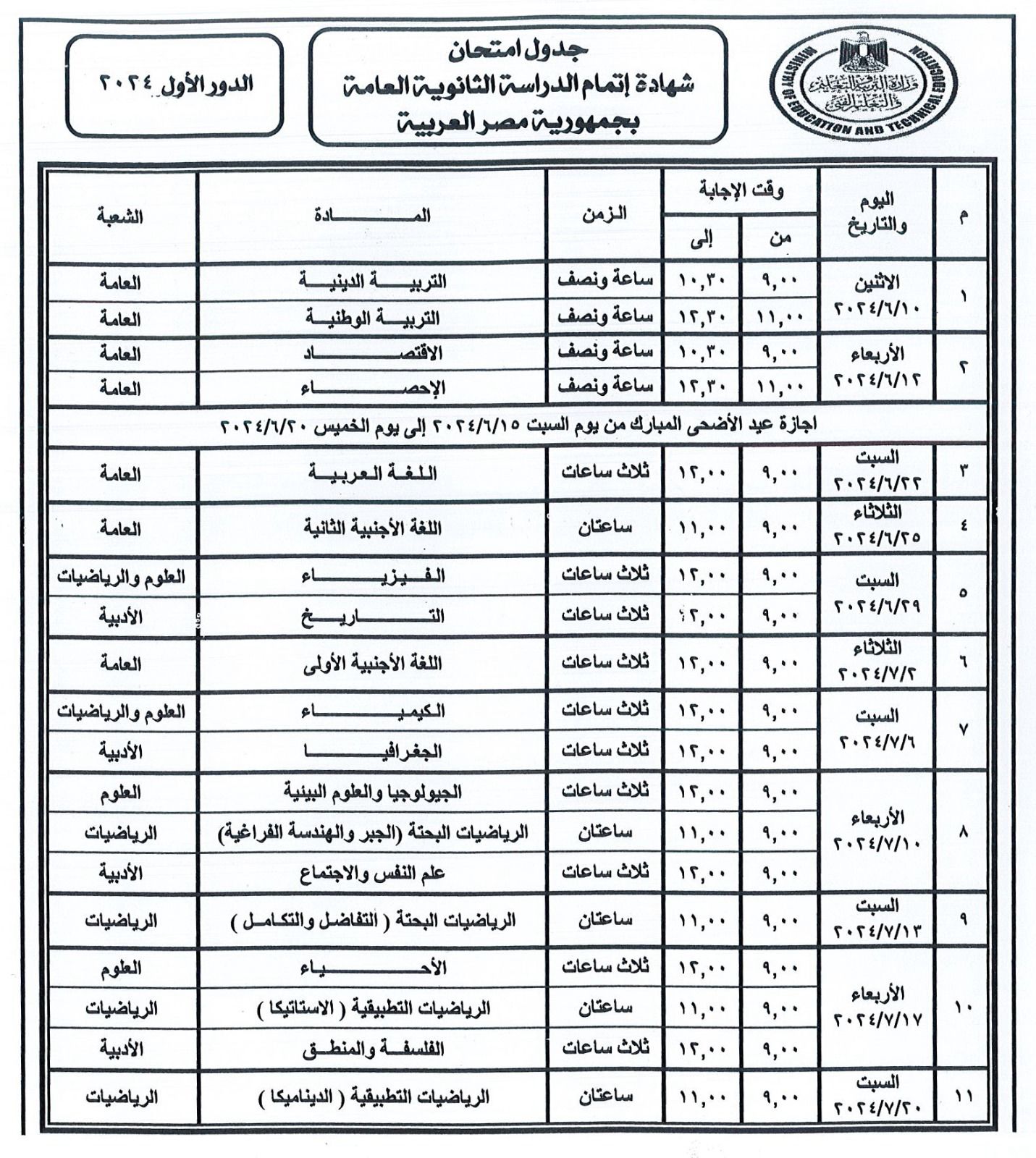 لطلاب أدبي.. ننشر جدول امتحانات الصف الثالث الثانوي 2024