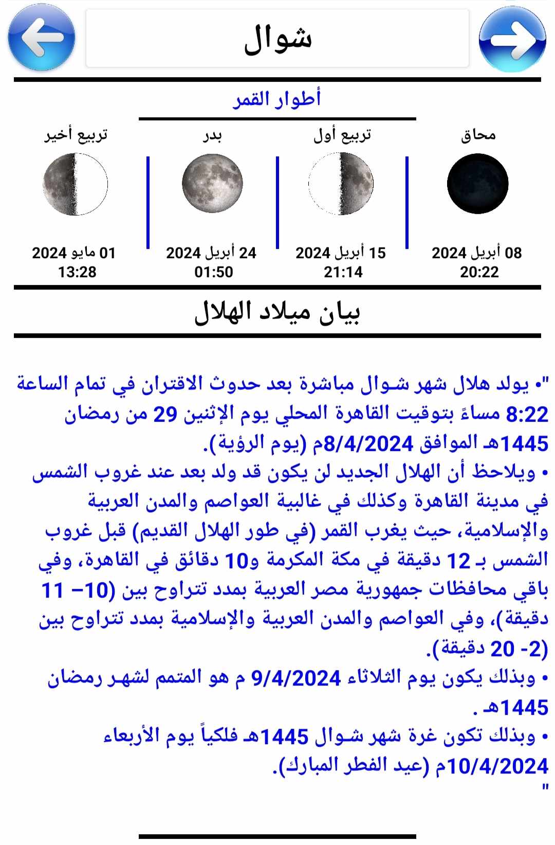 ووفقا للحسابات الفلكية، سيولد هلال شهر شوال مباشرة بعد حدوث الاقتران في تمام الساعة 8:22 مساء بتوقيت القاهرة المحلي في يوم الرؤية الموافق الإثنين 29 رمضان 1445 – 8/4/2024، وسيلاحظ عدم ولادة الهلال عند غروب الشمس في مدينة القاهرة وكذلك في غالبية العواصم والمدن العربية والإسلامية.