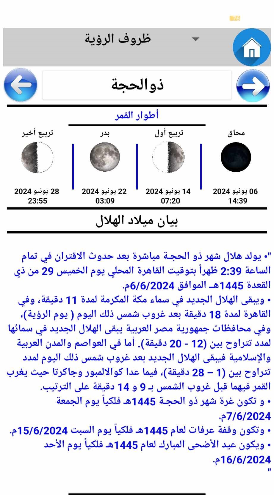 وتكون غرة شهر ذو الحجة 1445 هجريا فلكيا يوم الجمعة 7/6/2024 ميلاديا، وتكون وقفة عرفات لعام 1445 فلكيا يوم السبت 15/6/2024، ويكون عيد الأضحى المبارك فلكيا يوم الأحد 16/6/2024.