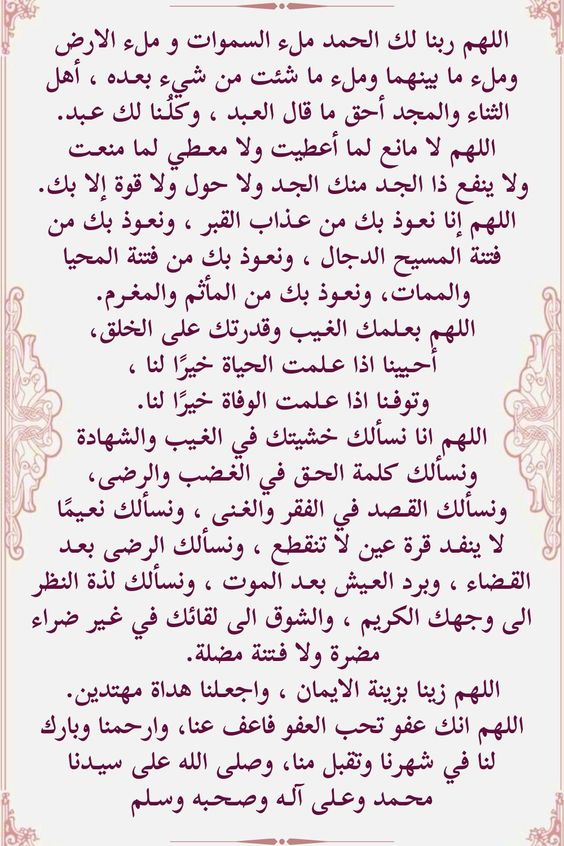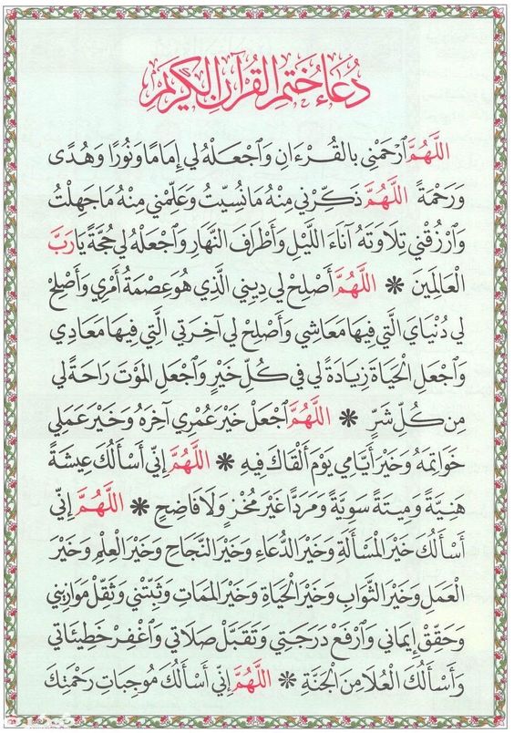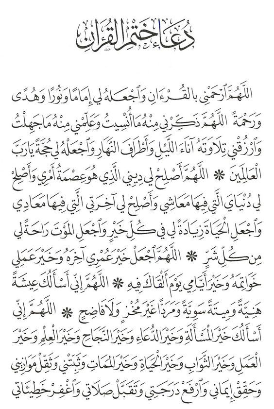 اللهم انقلنا بالقرآن من الشقاء إلى السعادة، ومن النار إلى الجنة،ومن الضلالة إلى الهداية، ومن الذل إلى العز، يا ذا الجلال والإكرام! ومن أنواع الشرور كلها إلى أنواع الخير كلها يا حي يا قيوم - اللَّهُمَّ اجعلنا بتلاوة كتابك مُثقّفين، وإلى لذيذ خطابه مُستمعين، ولأوامره ونواهيه خاضعين، وعند ختمه من الفائزين، ولثوابه حائزين، ولك في جميع شُهُورِنا ذاكرين، ولك في جميع أمُورِنا راجين.