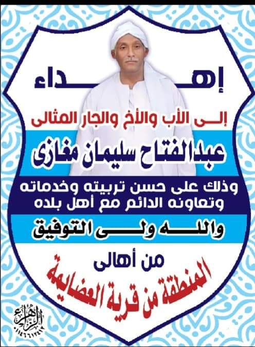 وقال أهالي القرية، إن تلك الجائزة تأتي عرفانا وتقديرا لجارهم لـ عبدالفتاح سليمان مغازي وتكريما له لكونه الرجل والأب والجار المثالي، وخادمًا لأهالي قريته.