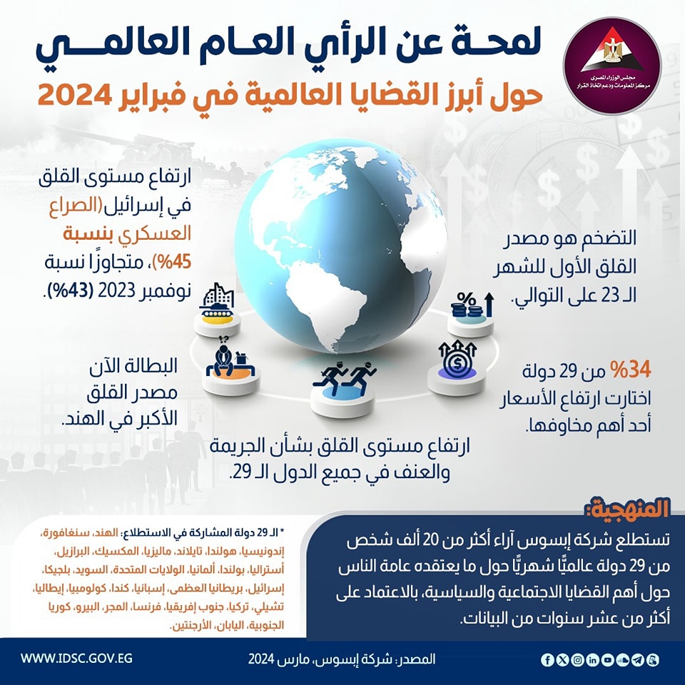 استعرض مركز المعلومات ودعم اتخاذ القرار بـ مجلس الوزراء، لمحة عن الرأي العام العالمي حول أبرز القضايا العالمية في فبراير 2024، لافتا أن 34% من مواطني 29 دولة اختارت ارتفاع الأسعار أحد أهم مخاوفها.