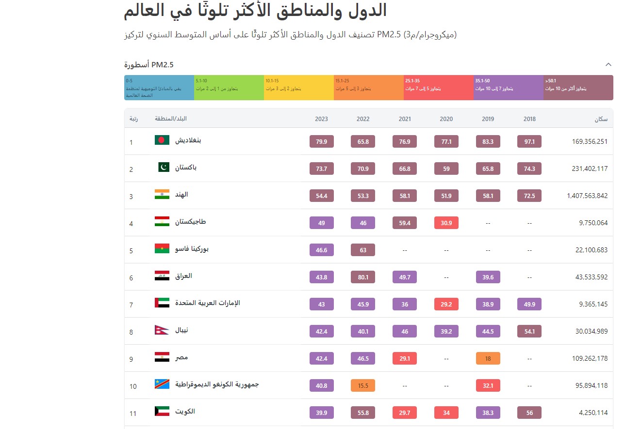 وجاء ترتيب الدول العشر الأكثر تلوثًا للهواء عالميًا وفقًا للشركة السويسرية كالتالي:
