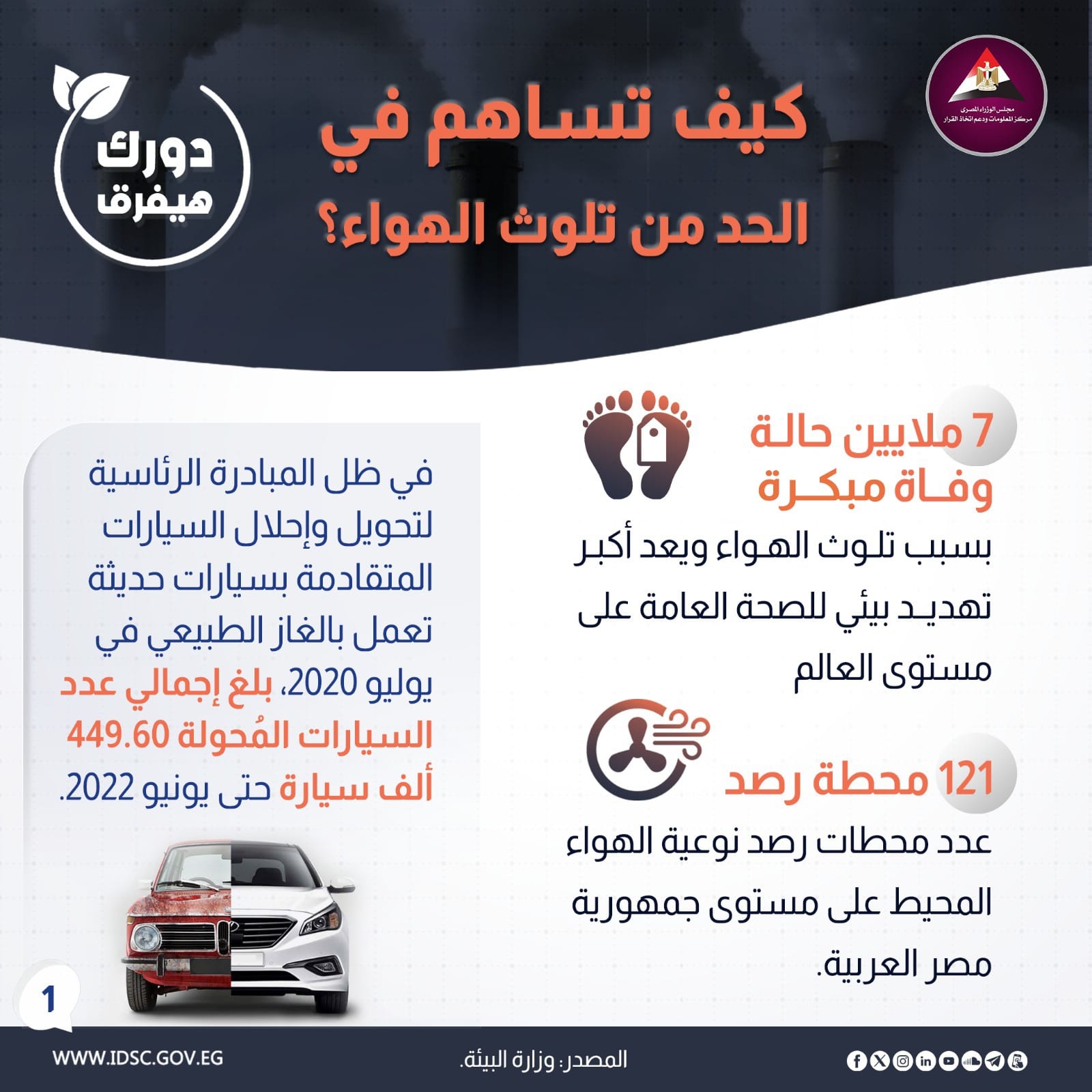 وأفاد معلومات الوزراء، خلال انفوجراف، عبر صفحته الرسمية على فيس بوك، بأن هناك 121 محطة رصد لنوعية الهواء المحيط على مستوى جمهورية مصر العربية، مضيفا أنه في ظل المبادرة الرئاسية لتحويل وإحلال السيارات المتقادمة بسيارات حديثة تعمل بالغاز الطبيعي في يوليو 2020، بلغ إجمالي عدد السيارات المحولة 449.60 ألف سيارة حتى يونيو 2022.