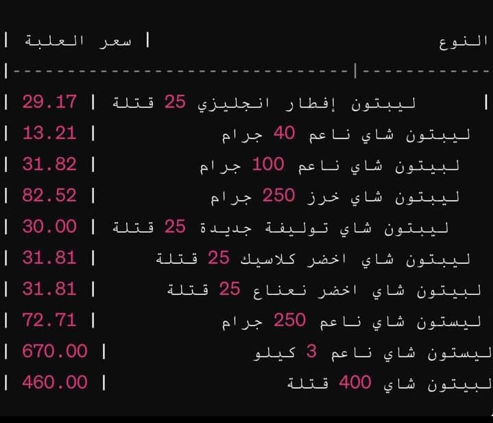 وصعد سعر شاي ليبتون خرز 250 جراما إلى 82.5 جنيه وزاد سعر شاي ليبتون أخضر كلاسك إلى 32 جنيها، وسعر شاي ليبتون توليفة جديدة 25 فتلة بنحو 30 جنيها للمستهلك بزيادة جنيهين.