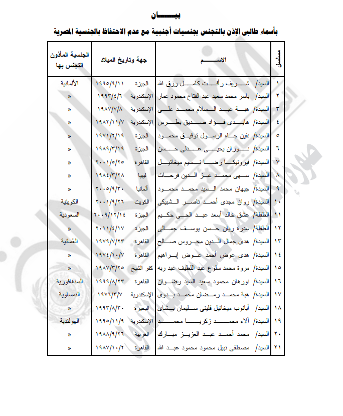 ونص القرار على أنه يؤذن لكل من الواحد والعشرين مواطنا (أولهم السيد/ شريف رأفت كامل وآخرهم السيد/ مصطفى نبيل محمود) بالتجنس بجنسية أجنبية مع احتفاظهم بالمصرية.