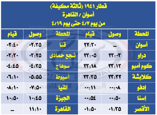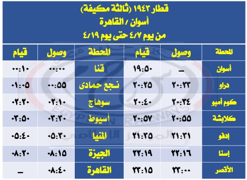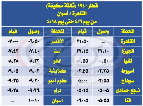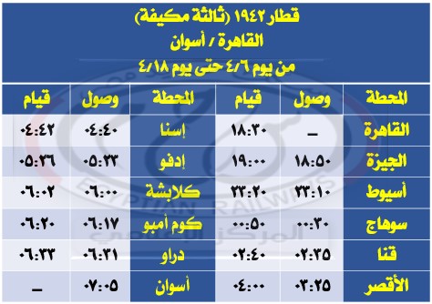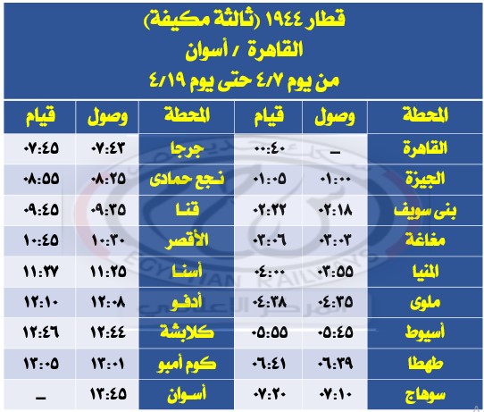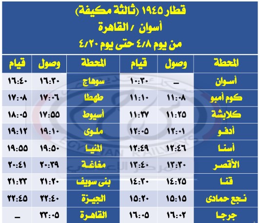 - تشغيل قطار 1944 ( ثالثة مكيفة ) القاهرة / أسوان يوميًا خلال الفترة من ليلة 6-7 / 4 / 2024 وحتى ليلة 18-19 / 4 / 2024 حيث يقوم من محطة القاهرة الساعة 00:40 ويصل أسوان الساعة 13:45 طبقا للجدول المرفق.