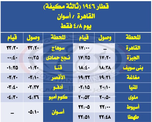 - تشغيل قطار 1946 ( ثالثة مكيفة ) القاهرة / أسوان يوم 8 / 4 / 2024 فقط حيث يقوم من محطة القاهرة الساعة 17:00 ويصل أسوان الساعة 05:10 طبقا للجدول المرفق.