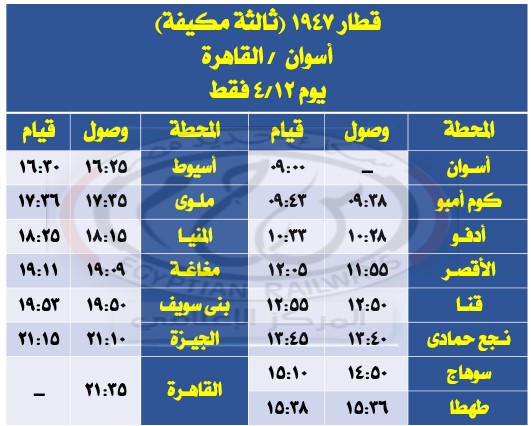 - تشغيل قطار 1947 ( ثالثة مكيفة ) أسوان / القاهرة يوم 12/4/2024 فقط حيث يقوم من محطة أسوان الساعة 09:00 ويصل القاهرة الساعة 21:35 طبقا للجدول المرفق.
