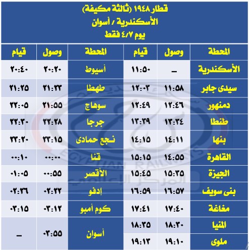 - تشغيل قطار 1948 ( ثالثة مكيفة ) الإسكندرية / أسوان يوم 7 / 4 / 2024 فقط حيث يقوم من محطة الإسكندرية الساعة 11:50 ويصل أسوان الساعة 03:55 طبقا للجدول المرفق على أن يتم تشغيل فوارغ القطار يوم 7 / 4 / 2024 فقط بين القاهرة / الإسكندرية حيث يقوم من القاهرة الساعة 00:10 ويصل الإسكندرية الساعة 02:35 طبقًا للجدول المرفق.