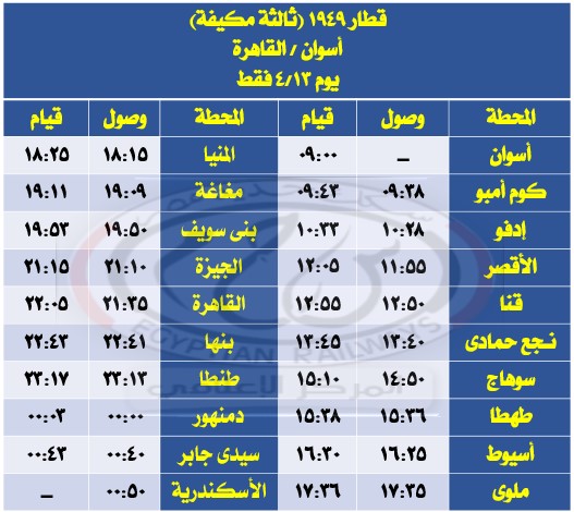 - تشغيل قطار 1949 ثالثة مكيفة أسوان / الإسكندرية يوم 13/ 4/ 2024 فقط محطة أسوان الساعة 09:00 ويصل الإسكندرية الساعة 00:50 طبقا للجدول المرفق على أن يتم تشغيل فوارغ القطار يوم 7 / 4 / 2024 فقط بين الإسكندرية / القاهرة حيث يقوم من الإسكندرية الساعة 11:50 ويصل الإسكندرية الساعة 14:15 طبقًا للجدول المرفق.