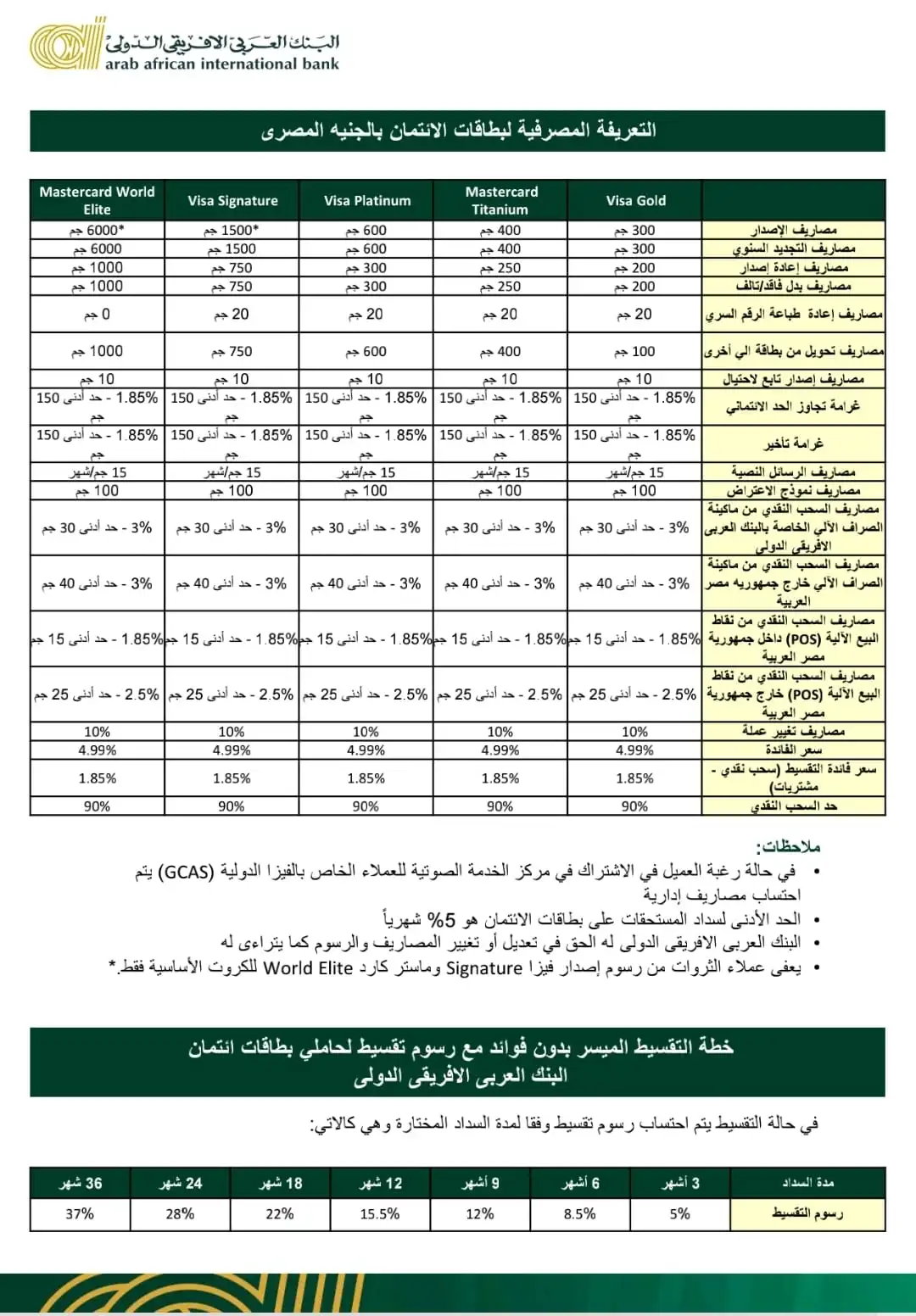 قرر البنك العربي الأفريقي الدولي تعديل المصروفات الخاصة بالبطاقات الائتمانية، على جميع بطاقات البنك المختلفة، فيزا جولد وماستر كارد تيتينيوم، وفيزا بلاتينيوم، وفيزا سيجنتشر، وماستر كارد وورلد إليت.