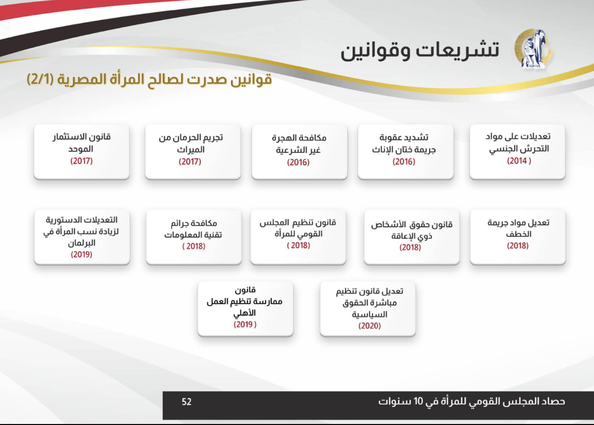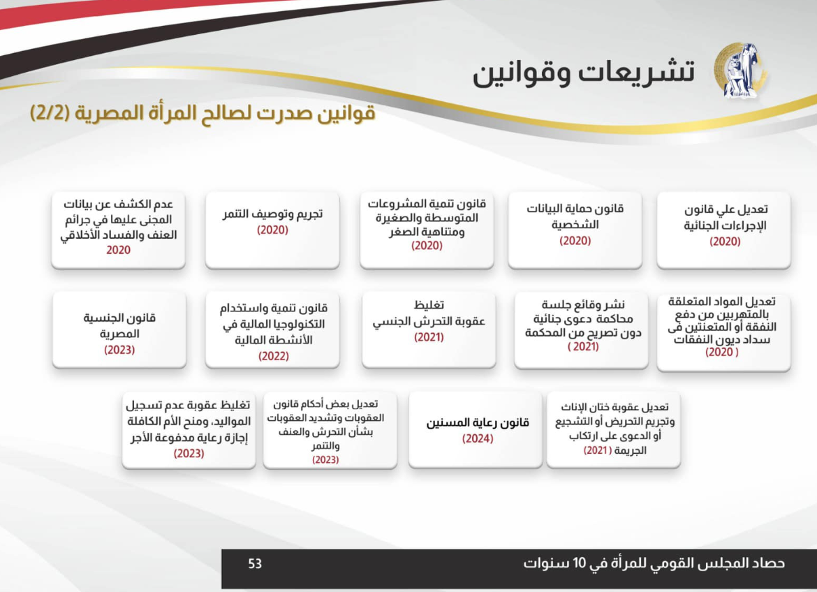 وجاءت أبرز تلك التشريعات والقوانين التي صدرت لصالح المرأة في آخر 10 سنوات؛ تجريم الحرمان من الميراث في 2017، وتعديلات على مواد التحرش الجنسي في 2014، وتشديد عقوبة جريمة ختان الإناث في 2016، وقانون تنظيم المجلس القومي للمرأة في 2018، والتعديلات الدستورية الزيادة نسب المرأة في البرلمان في 2019، وتغليظ عقوبة التحرش الجنسي في 2021، وتغليظ عقوبة عدم تسجيل المواليد، ومنح الأم الكافلة إجازة رعاية مدفوعة الأجر في 2023.