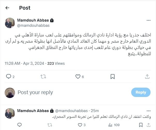 وفي تغريدة نشرها عبر حسابه على منصة إكس قال ممدوح عباس: أختلف جذريا مع رؤية إدارة نادي الزمالك وموافقتهم على لعب مباراة الأهلي في الدوري العام خارج مصر.