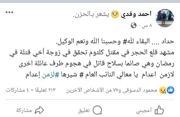وكتب وفدي عبر صفحته الشخصية عبر موقع التواصل الاجتماعي فيسبوك: حسبنا الله ونعم الوكيل.. مشهد قلع الحجر في مقتل كلثوم تحقق في زوجة أخي، قتلت في رمضان وهي صائمه بسلاح قاتل في هجوم من طرف عائلة أخرى، مطالبا بمعاقبة المتهم بالإعدام.