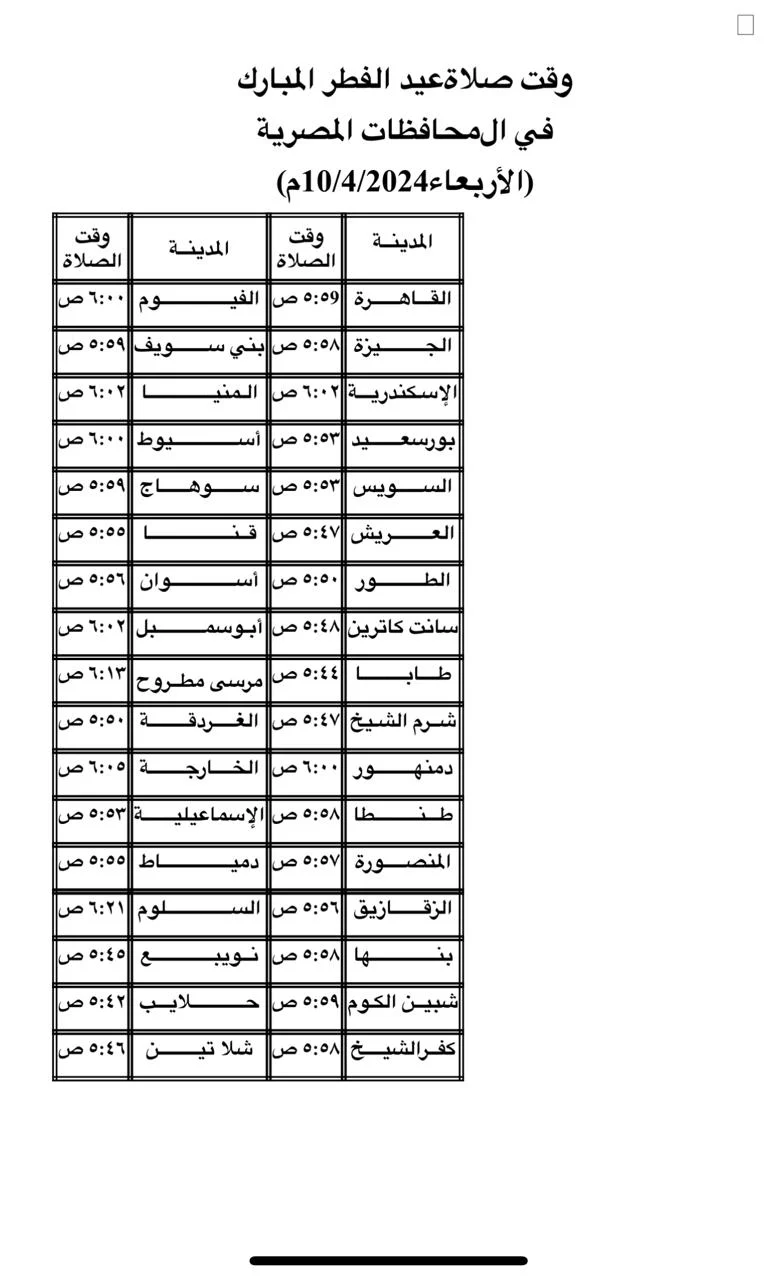 وينشر القاهرة 24، موعد ووقت صلاة عيد الفطر 2024 في القاهرة وجميع المحافظات في السطور التالية، والتي جاءت كالتالي: