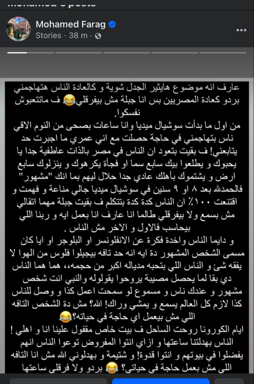 وقال محمد فرج، عارف إنه الموضوع يثير الجدل وكالعادة الناس تهاجمني، بس أنا جبلة متتعبوش نفسكم، من أول ما بدأت سوشيال ميديا وأنا ساعات بصحى من النوم ألاقي الناس بتهاجمني في حاجة حصلت، مع إن عمري ما أجبرت حد على يتابعني.