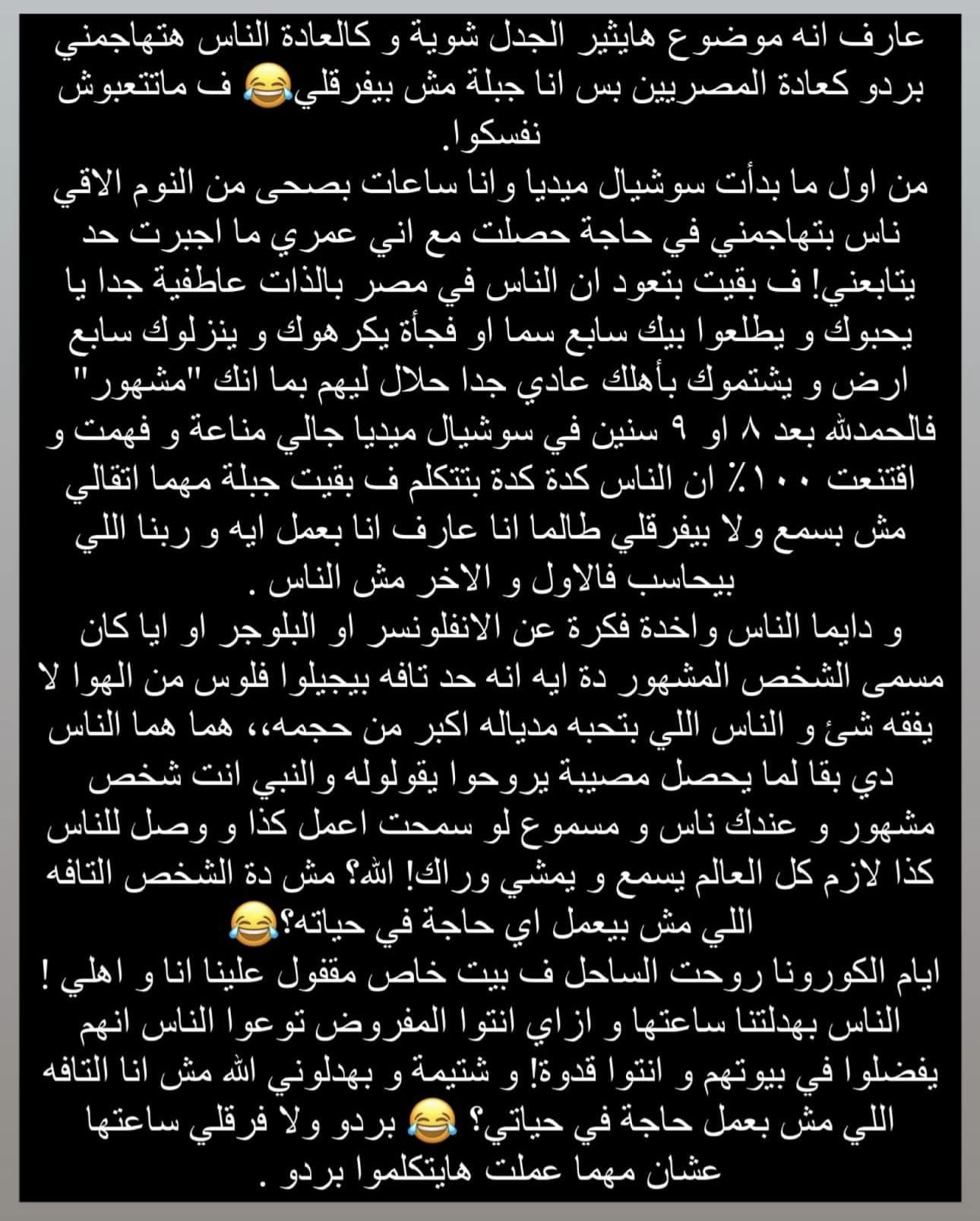وأضاف البلوجر محمد فرج، اتعودت إن الناس في مصر بالذات عاطفية.. يحبوك ويطلعوا بك سابع سماء أو فجأة يكرهوك وينزلوك الأرض ويشتموك بأهلك.. عادي جدًا حلال لهم، الحمد لله بعد 8 سنين في السوشيال ميديا جالي مناعة وفهمت واقتنعت 100% إن الناس كده كده بتتكلم، فبقيت جبلة، ومهما اتقالي مش بسمع ولا بيفرق لي طالما أنا عارف أنا بعمل إيه وربنا بيحاسب في الأول والآخر مش الناس.