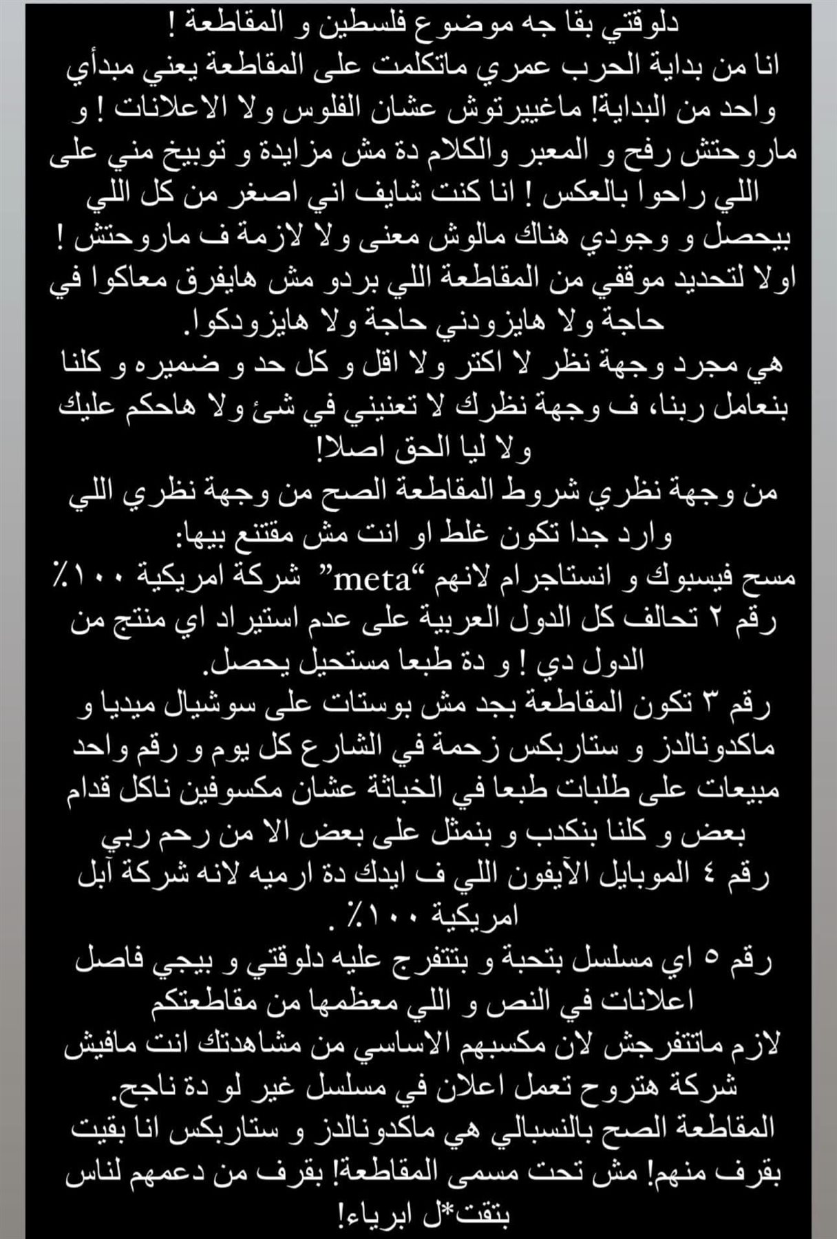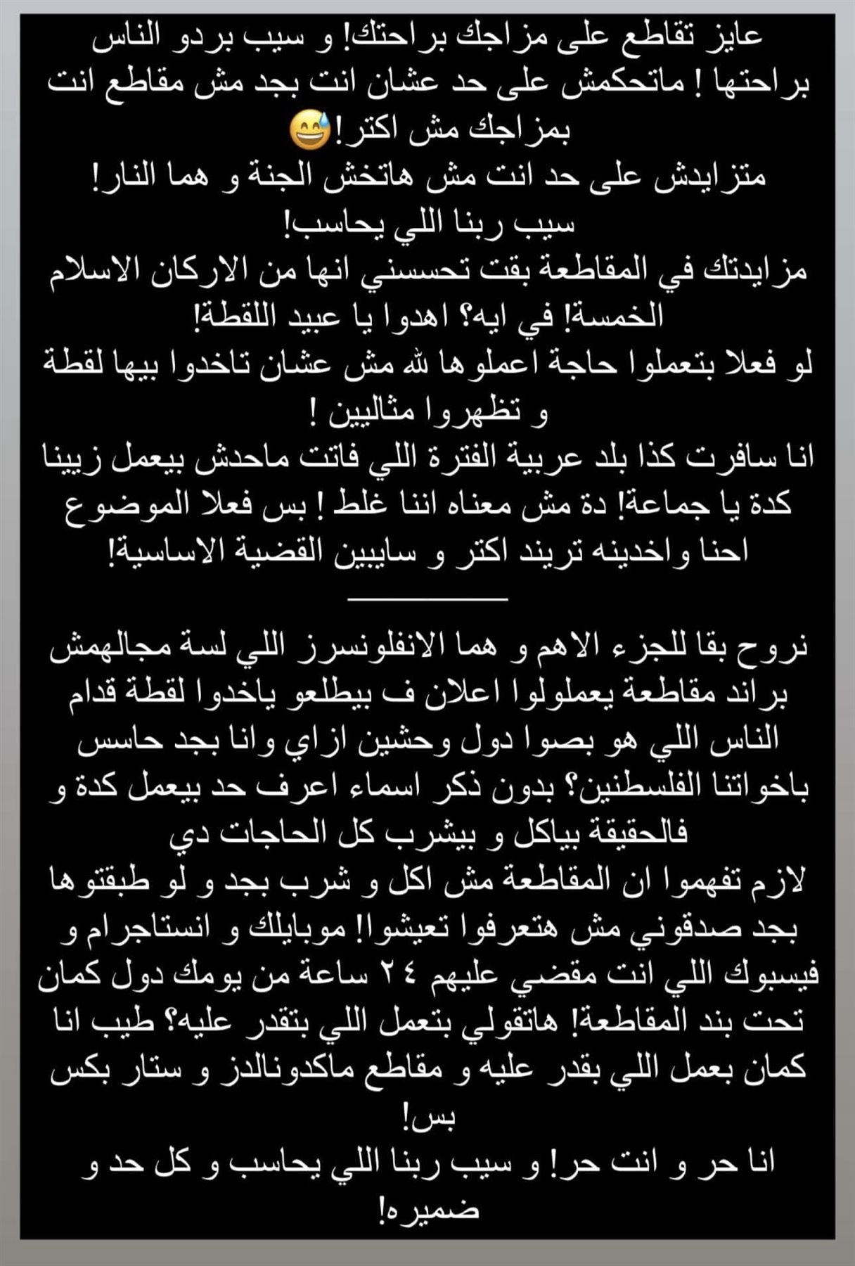 واختتم فرج، تحديد موقفي من المقاطعة اللي بردو مش هيفرق معاكوا في حاجة ولا يزودني حاجة ولا هيزودكوا، هي مجرد وجهة نظر لا أكثر ولا أقل، وكل واحد وضميره وكلنا بنعامل ربنا، ووجهة نظرك لا تعنيني في شيء ولا هحكم عليك ولا ليا الحق أصلا.