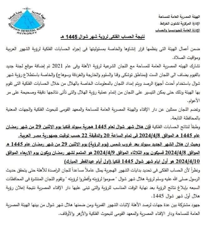هيئة المساحة: الأربعاء 10 أبريل أول أيام عيد الفطر فلكيا