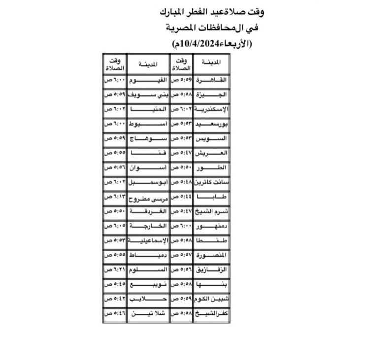 موعد صلاة عيد الفطر 2024 في القاهرة ومحافظات الجمهورية فلكيًا