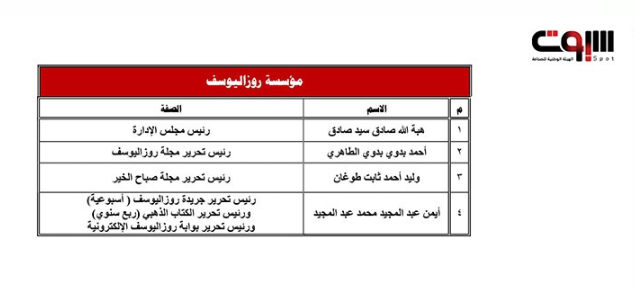 حيث أعلنت الهيئة الوطنية للصحافة اليوم برئاسة المهندس عبد الصادق الشوربجي، عن تجديد الثقة لرئيس التحرير أحمد الطاهري، وتعيين هبة الله صادق سيد صادق كرئيس مجلس إدارة، وأيمن عبد المجيد محمد عبد المجيد كرئيس تحرير جريدة روز اليوسف (الأسبوعية)، ورئيس تحرير الكتاب الذهبي (ربع سنوية)، ورئيس تحرير بوابة روز اليوسف الإلكترونية، وتعيين وليد ثابت طوغان كرئيس تحرير مجلة صباح الخير.