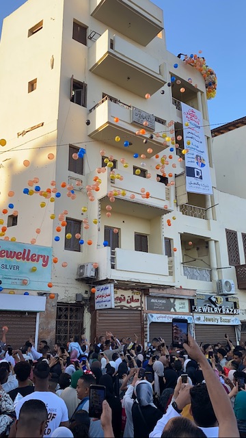 وأطلقت البالونات والتي وضعت في شباك بالساحة عقب صلاة العيد في أجواء امتلأت بالبهجة والسعادة والفرح كما تم توزيع الحلوى والشيكولاتة بهجة بالعيد.