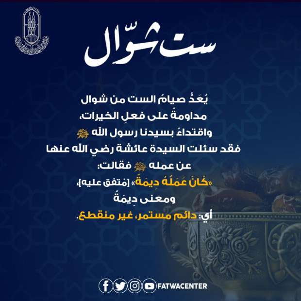 وأوضحت أن الأيام من شوال يُندَب صيامُها بعد شهر رمضان ويومِ الفطر؛ لقول النبي صلى الله عليه وآله وسلم: "مَنْ صَامَ رَمَضَانَ ثُمَّ أَتْبَعَهُ سِتًّا مِنْ شَوَّالٍ كَانَ كَصِيَامِ الدَّهْرِ".