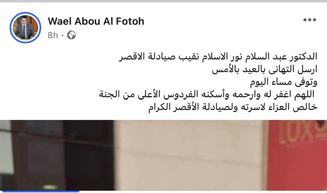 وتحولت صفحات موقع التواصل الاجتماعى فيسبوك، إلى دفتر عزاء، لنعي الدكتور عبد السلام نور نقيب صيادلة الأقصر، حزنا على الفقيد داعين له بالرحمة والمغفرة.