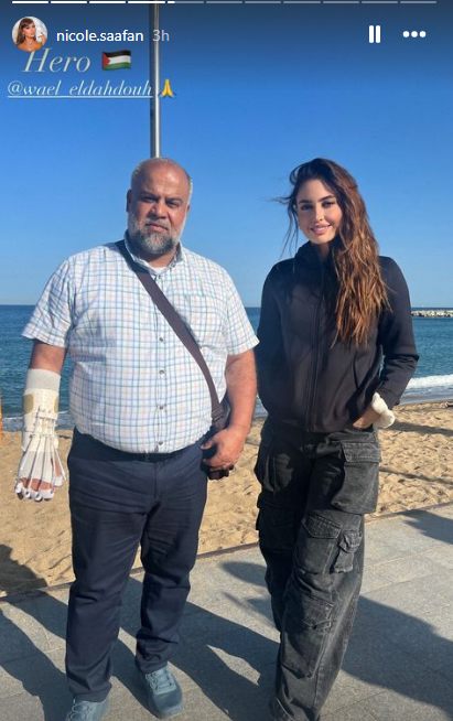 وتقابلت نيكول سعفان زوجة المخرج طارق العريان أثناء رحلتهما في إسبانيا، مع الصحفي والإعلامي الفلسطيني وائل الدحدوح، حيث نشرت صورة عبر خاصية استوري على حسابها الشخصي، على موقع تبادل الصور والفيديوهات انستجرام، وعلقت عليها: hero بطل.