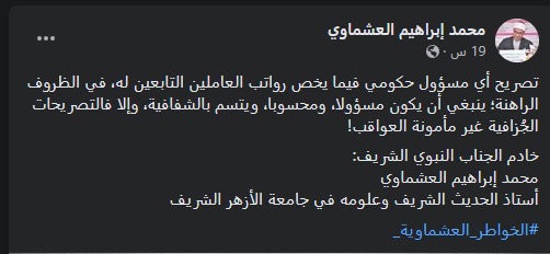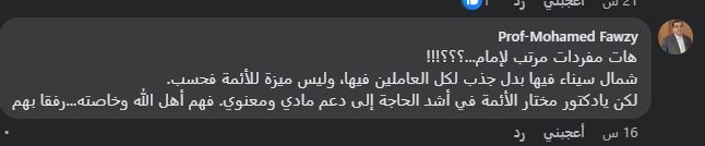 وأضاف محمد فوزي: هات مفردات مرتب الإمام، شمال سيناء فيها بدل جذب لكل العاملين فيها، وليس ميزة للأئمة فحسب، لكن يا دكتور مختار الأئمة في أشد الحاجة إلى دعم مادي ومعنوي. فهم أهل الله وخاصته...رفقا بهم».