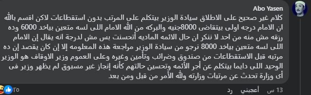 وقال شخص يدعى عمرو طنطاوي: يبقى المفروض إمام المسجد يركب أعلى فئة في السيارات الفاخرة يعنى السنة كده حوالى 140 ألف ده غير الحوافز والمناسبات، فيما علق قال آخر يدعى أبوياسين: كلام غير صحيح على الإطلاق سيادة الوزير بيتكلم على المرتب بدون استقطاعات لكن أقسم بالله إن الإمام درجه أولى بيتقاضى 8000 جنيه والبركة من الله، الإمام اللي لسة متعين بياخد 6000، وده رزقه مش منة من أحد لا ننكر أن حال الأئمة المادية اتحسنت بس مش لدرجة إنه يقال إن الإمام اللي لسة متعين بياخد 8000 نرجو من سيادة الوزير مراجعة هذه المعلومه إلا إذا كان يقصد إن ده مرتبه قبل الاستقطاعات من صندوق وضرائب وتأمين وغيره وعلى العموم وزير الأوقاف هو الوزير الوحيد اللى دايما بيتكلم عن أجر الأئمة وتحسين حالتهم كأنه إنجاز غير مسبوق لم يظهر وزير في أي وزارة تحدث عن مرتبات وزارته ولله الأمر من قبل ومن بعد.